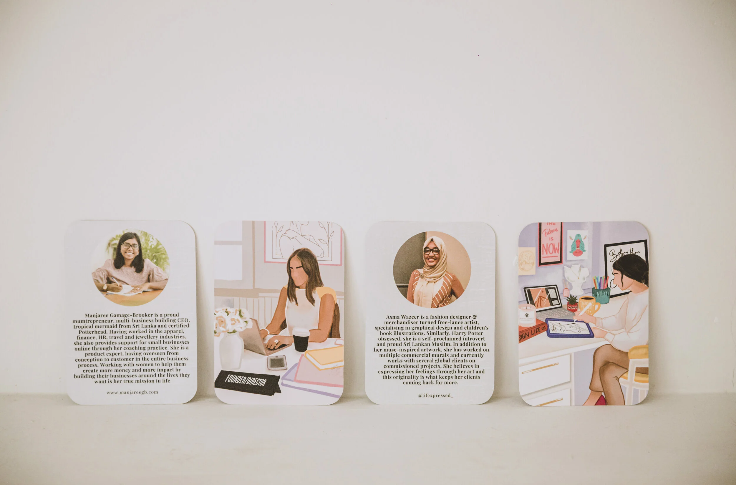 The cards offer 35 different statements, along with multiple prompts to offer you guidance by cultivating a positive mindset and asking you questions to action your thoughts - written by me, your business coach Manjaree Gamage-Brooker. Accompanied by original illustrations by the incredible Asma Wazeer , each card beautifully captures a female CEO doing what they love and represents the wide spectrum of female entrepreneurship, from students to mums, showcasing women of every colour.